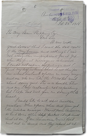 By late February, however, families appear to have received word of the ship sinking. Nellie Reid, wife of Captain M.B. Reid, wrote on 25 February 1918: