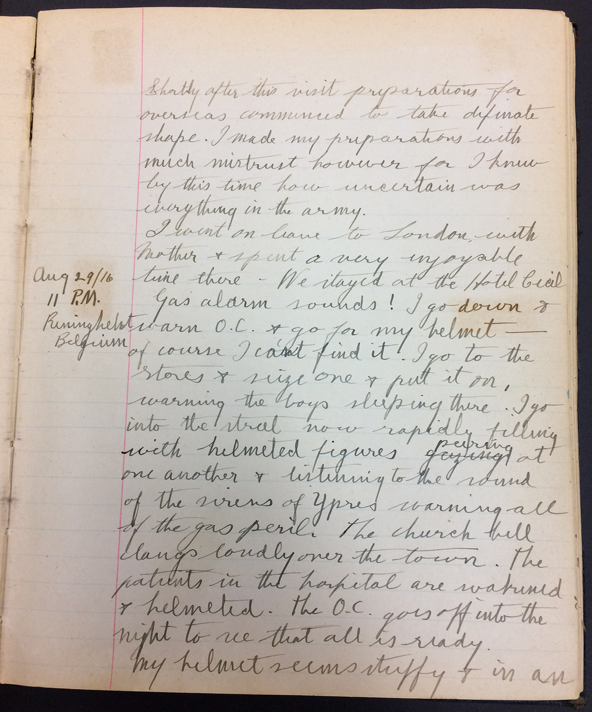Gas alarm sounds! I go down and warn O.C. and go for my helmet – of course I can't find it. I go to the stores and seize one and put it on, warning the boys sleeping there. I go into the street now rapidly filling with helmeted figures peering at one another and listening to the sound of the sirens of Ypres. … My helmet seems stuffy and in an unguarded moment I breathe through my nose – at once the googles are dimmed and I take a chance and go inside, take off the helmet and wipe them. Putting it on again, I go outside. Here we are all ready but my mind dwells on the poor fellows up in the front line who have but a few minutes warning. How are they faring?