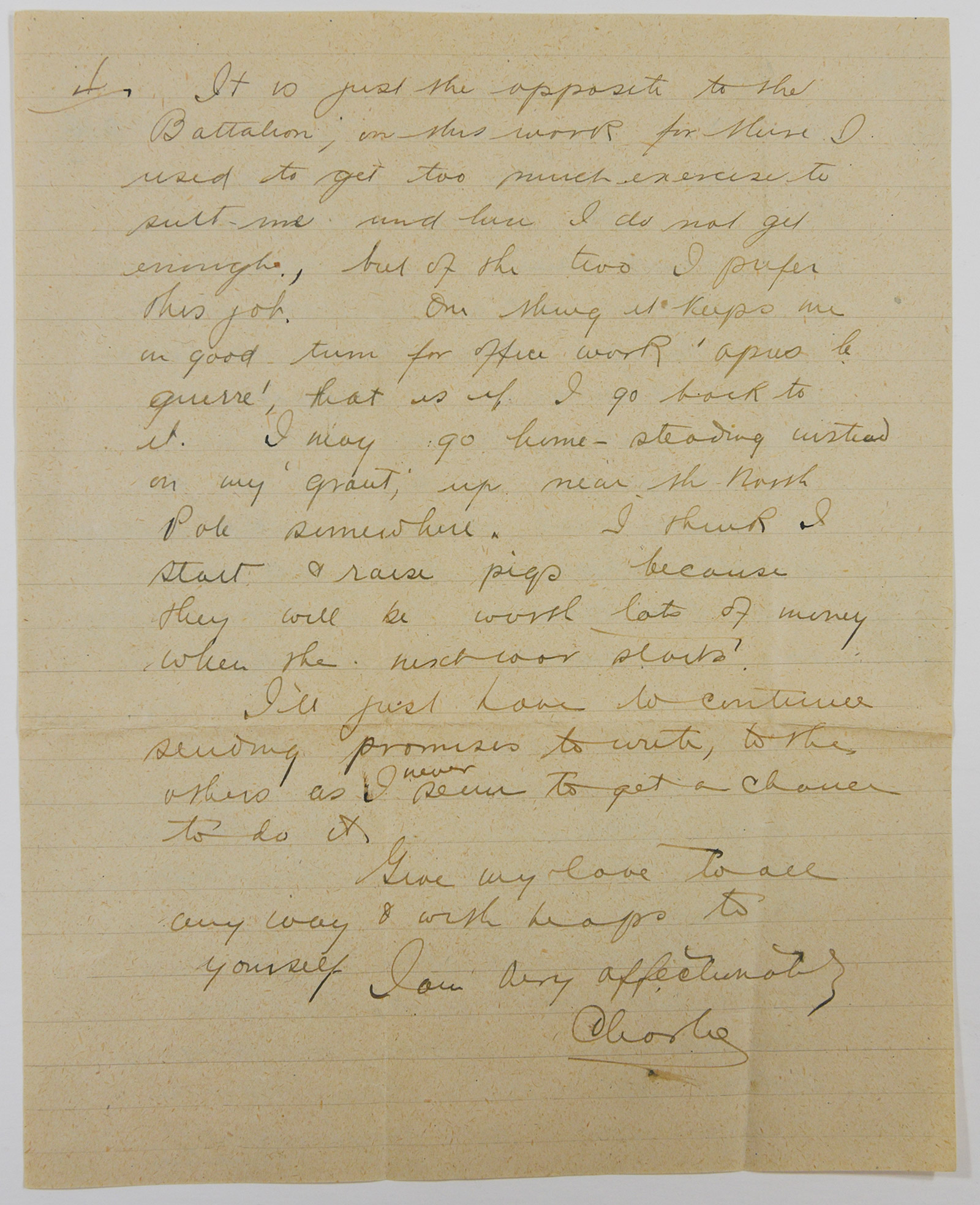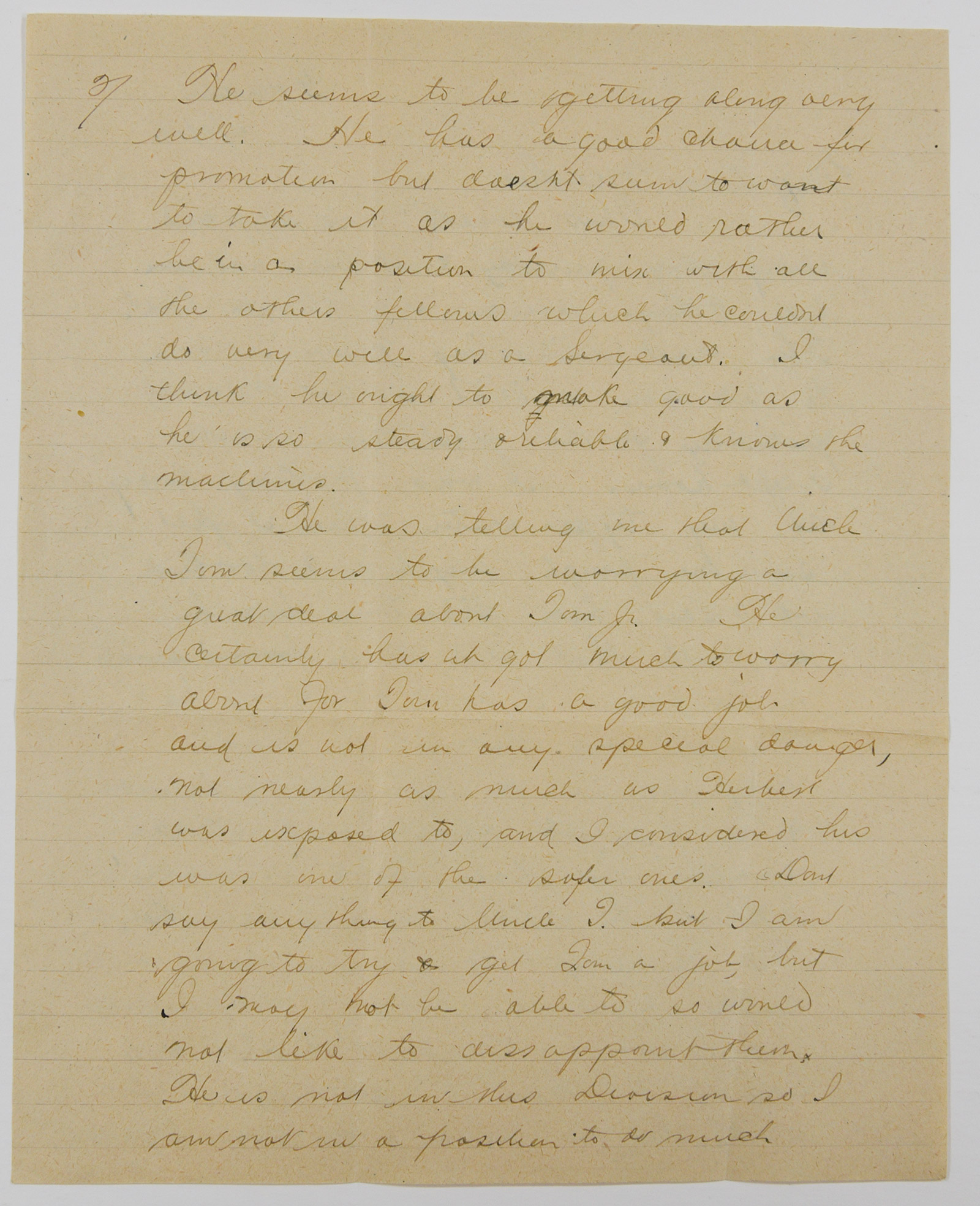 Il parle aussi de sa famille en Angleterre, à qui les trois frères ont rendu visite lors de leur entraînement en Angleterre et pendant les permissions, ainsi que de Herb, qui avait été blessé et qui attenzdait d’être renvoyé à la maison au Canada. Enfin, il s’exprime sur son travail de bureau actuel qu’il préfère au bataillon, même si son poste ne lui procure pas assez d’exercice.