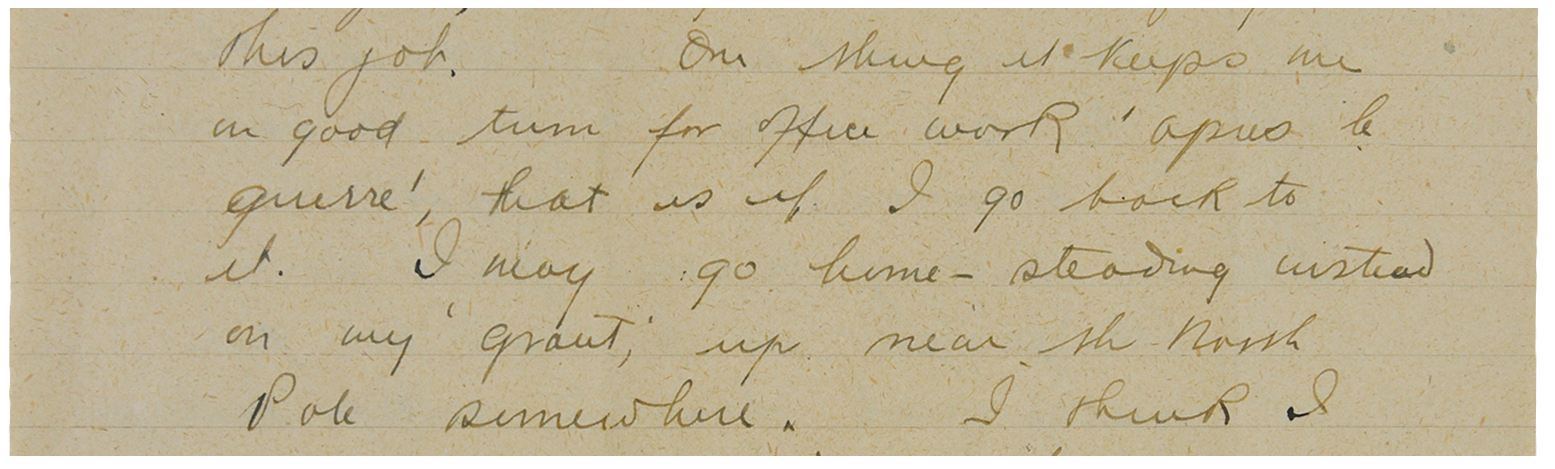 Il croit tout de même que ce travail le garde en « good turn for office work 'apres le guerre' », à moins qu’il décide d’aller établir une propriété familiale rurale sur son « 'grant', up near the North Pole somewhere »!
