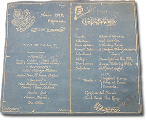 Collinson often wrote diary entries in his scrapbook noting where he went and would sometimes paste sketches and written notes about what he did during the day. In one entry, he helped prepare Christmas dinner for his men in 1917.
