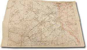 As an officer, Collinson viewed several intelligence documents regarding enemy positions and movements. The scrapbook contains maps showing both German and British trench lines. In this map near Lens in March 1918, German trenches are highlighted in red while British trenches are highlighted in blue.