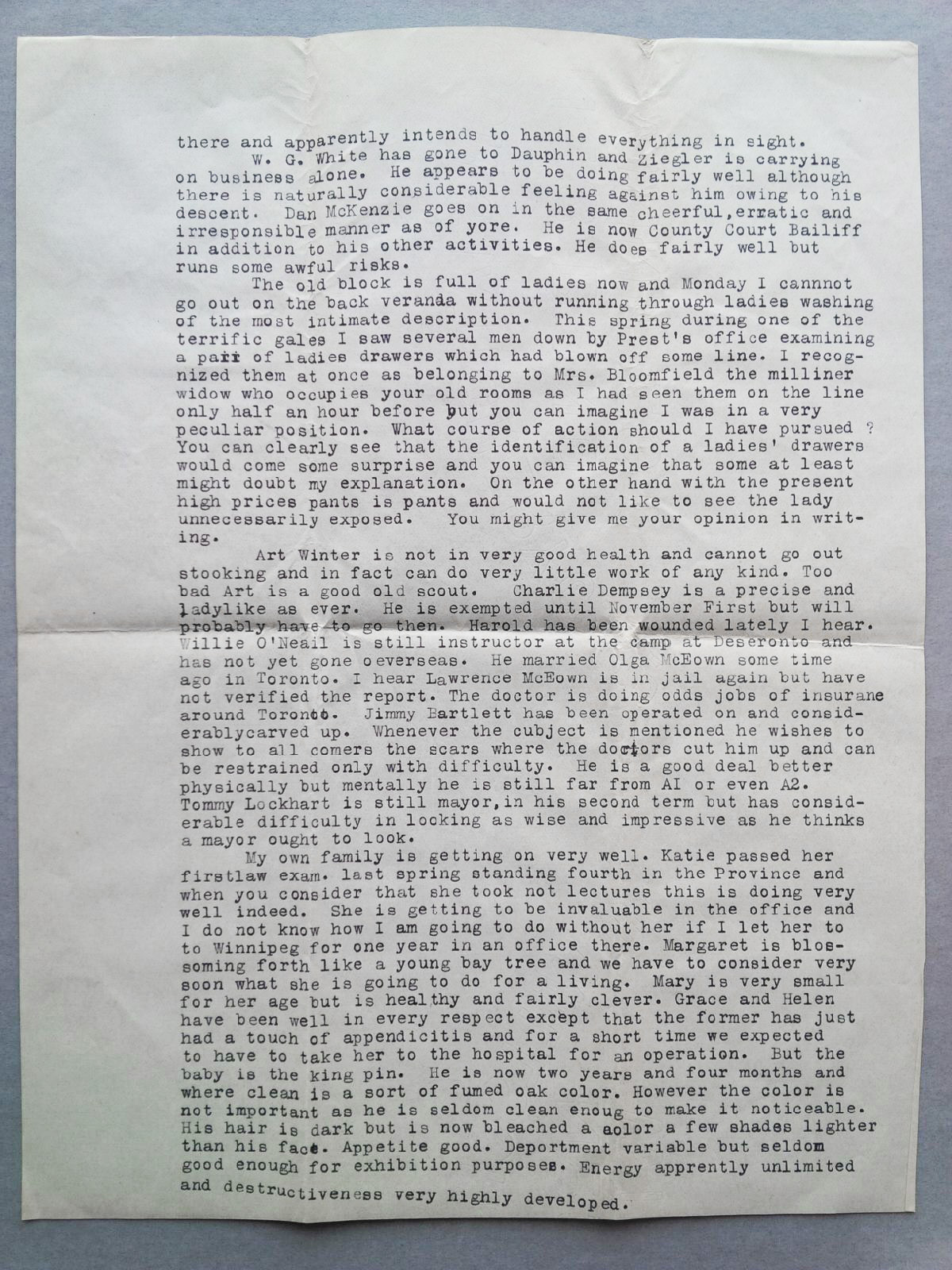 « I was stopped twenty times in the next few hours by people who had been shocked by the news and in many cases was quite unable to convince them that the news was not true for by the end of the first hour details were known of your taking off and hot the news had come so that a simple denial was quite inefficacious. However the report showed one thing clearly, that you had a great many friends in the town and the district and I heard and overheard people talking in a way that would have warmed your heart if you could have heard them; and some of them people with whom you used to scrap pretty vigorously in the olden days. »