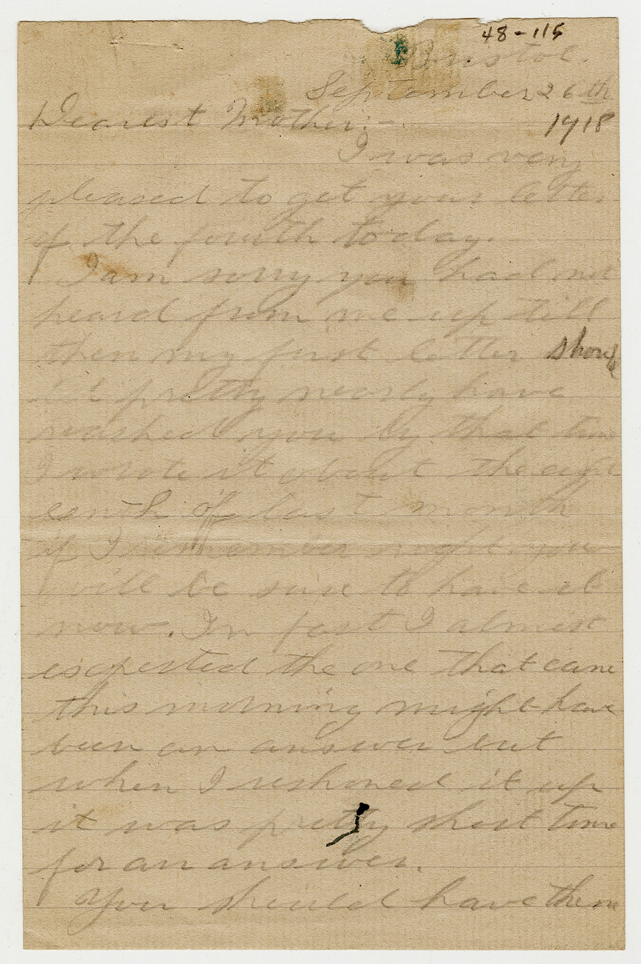 You asked me how long I had to stay in the line etc after I was hit. I was able to walk out with aid of one of the chaps. Owing to my leg and loss of blood I wasn’t able to go very far by my self. I had to beat it as fast as I could for a couple of hundred yards after I got hit as he turned a machine gun up the road. I lay [in] the remains of an old cellar for a few hours and old Fritz peppered round it pretty lively with his five mines in fact he hit it but not the part I was in. Then I tried to make it out with two runners that were going. But we only got about half a mile it was pretty dark and we got tangled up in barbed wire entanglements. And not being able to use my leg much we hunted up a punk hole and camped till day light. Then we started out again and after about three hours made the first dressing station in a old ? about two miles out. It wasn’t till then I found how much l blood I had lost when he cut of my shirt tail and the front of my pants it was well soaked. Then I had to make another mile or so to the ambulance.