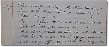 “Clear and fine to-day with strong breeze from North West at a.m. moderating a little during p.m. Again – Again – When will it end? We are still at odd jobs around the post. Three of our servants are still ill with the Flu; But as there are three trusty servants, we will come off – yea – more than conquerors.”
