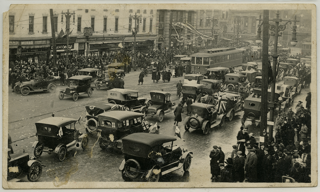 Les Manitobains ont célébré l’Armistice dans toutes les régions de la province. Cette photographie montre les célébrations sur l’avenue Portage, à Winnipeg.