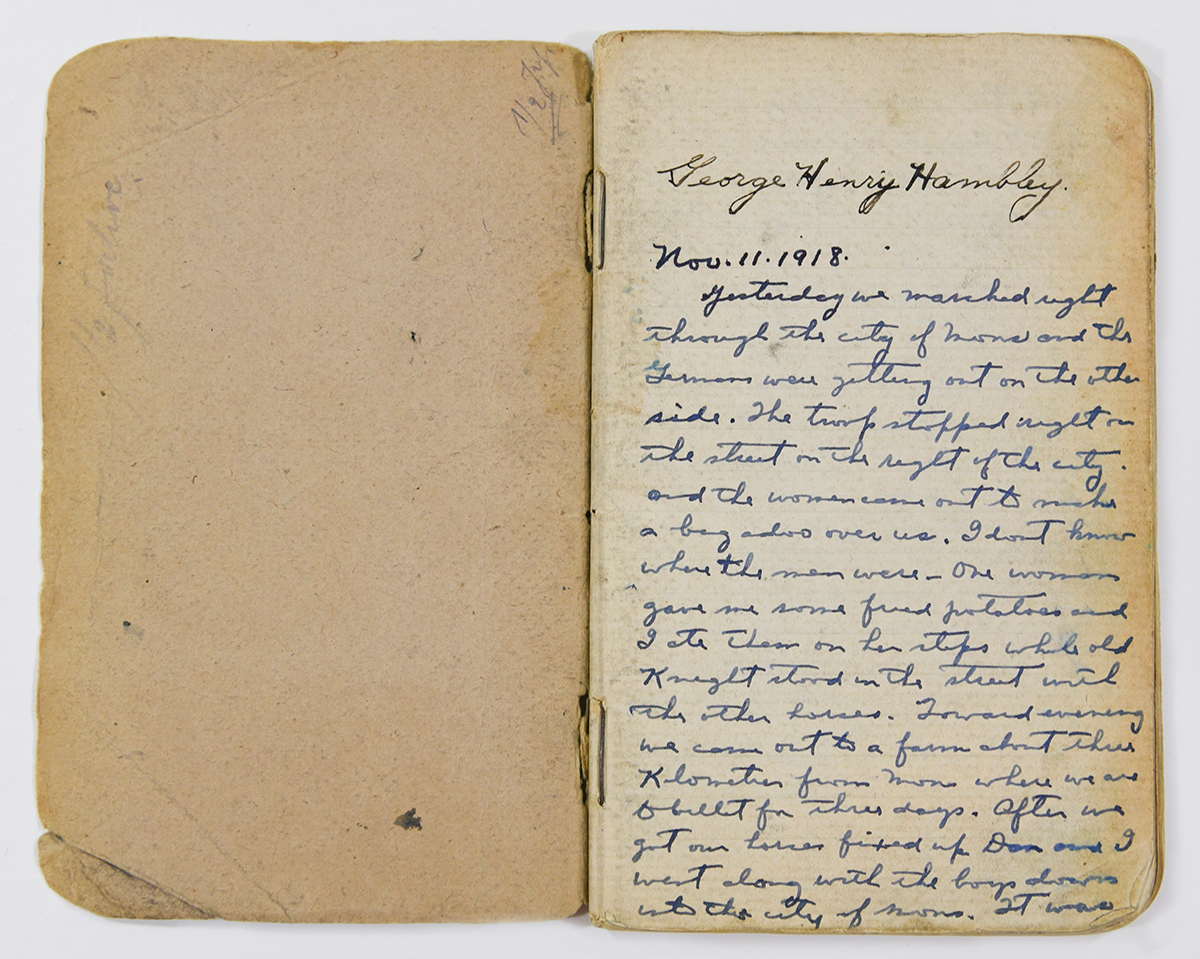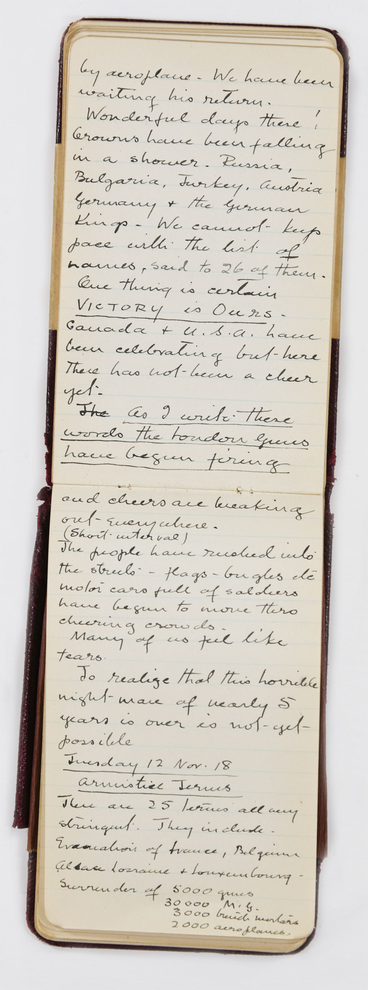 Nous possédons plusieurs documents, lettres et entrées de journal provenant de Manitobains qui étaient en France, en Belgique et en Angleterre quand l’Armistice a été signé. Trois entrées de journal datées du 11 novembre 1918 sont rapportées ci‑dessous.