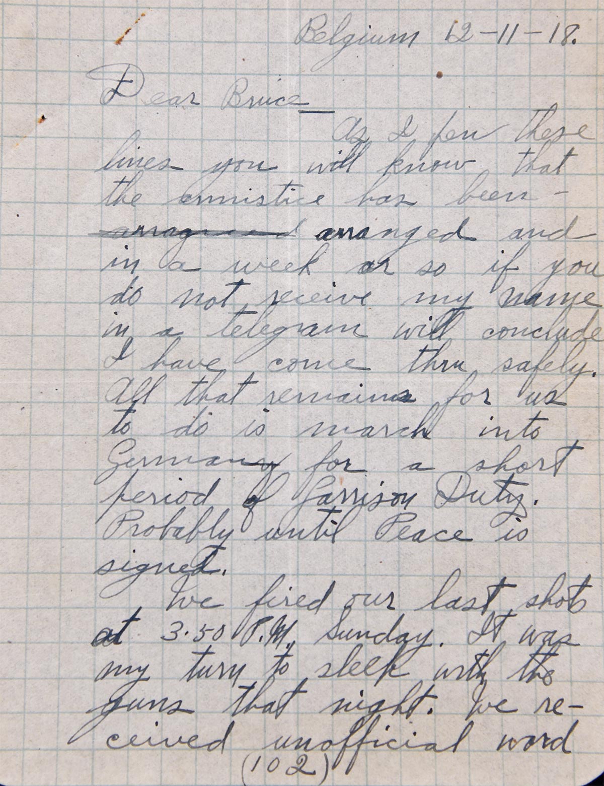 « As I pen these lines you will know that the armistice has been arranged and in a week or so if you do not receive my name in a telegram will conclude I have come thru safely. All that remains for us to do is march into Germany for a short period of Garrison Duty. Probably until Peace is signed.
