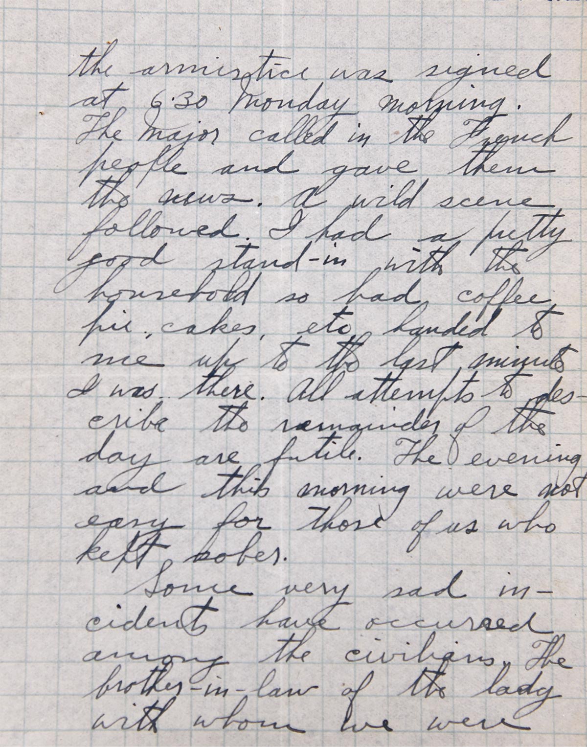 We fired our last shots at 3:50 P.M. Sunday. It was my turn to sleep with the guns that night. We re-ceived unofficial word the armistice was signed at 6:30 Monday morning. The Major called in the French people and gave them the news. A wild scene followed. I had a pretty good stand-in with the household so had coffee pie, cakes, etc. handed to me up to the last minute I was there. All attempts to describe the remainder of the day are futile. The evening and this morning were not easy for those of us who kept sober. »