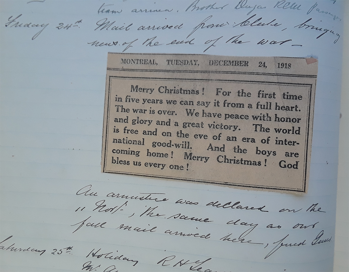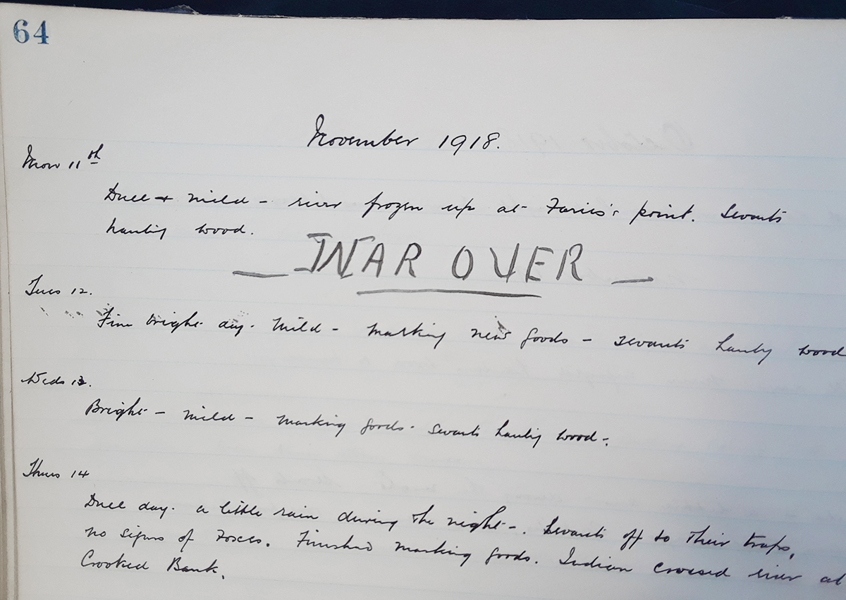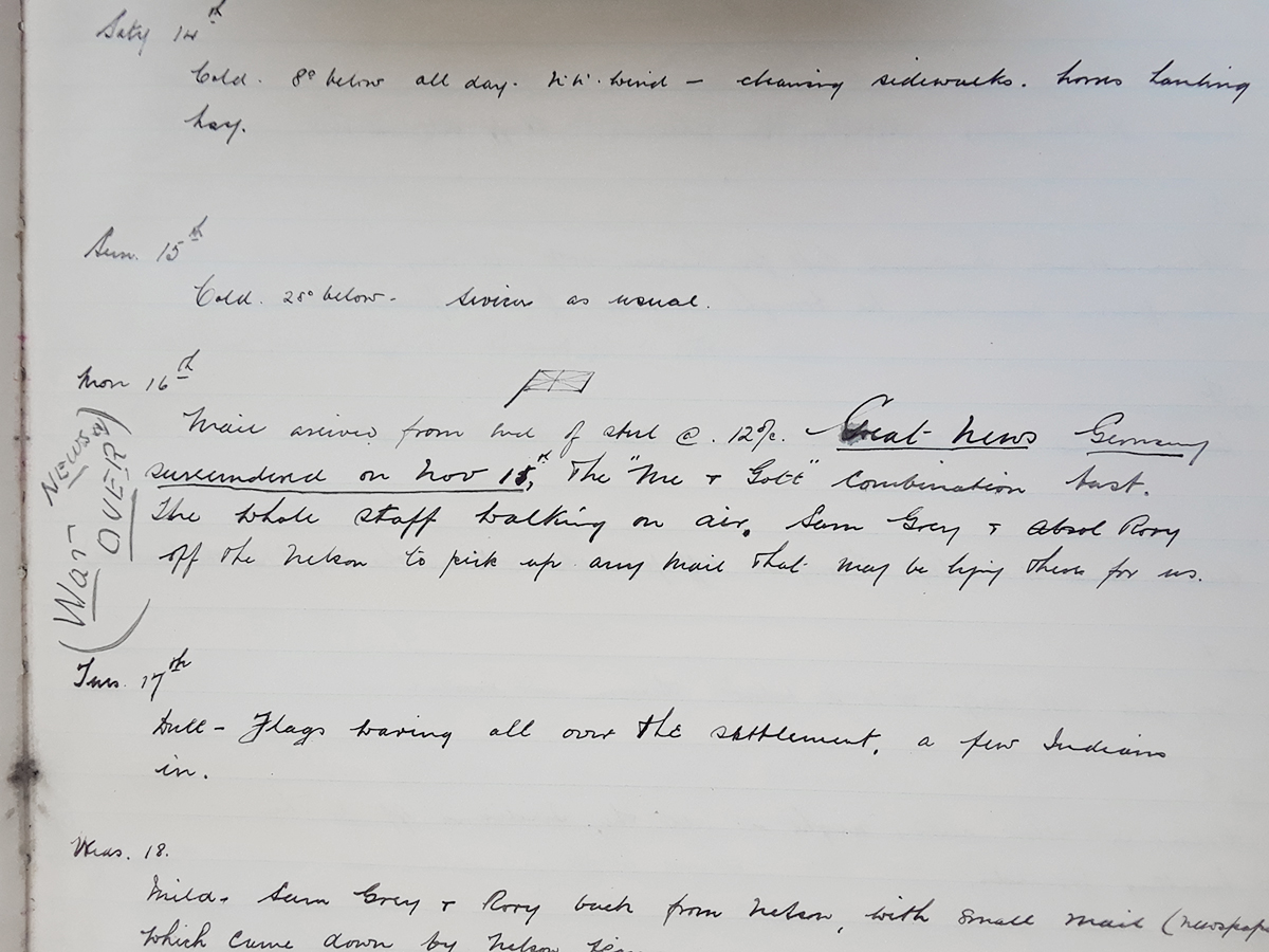 D’autres auteurs de journaux apprennent que la guerre a pris fin quelques jours après la signature de l’Armistice. Le directeur du poste de Buffalo River, en Saskatchewan, apprend la nouvelle le 14 novembre :