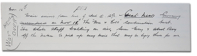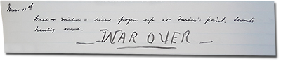 « Mail arrived from end of steel @ 12 oc. Great News Germany surrendered on Nov 11th, the ‘___ & ___’ combination [past?]. The whole staff walking on air. »
