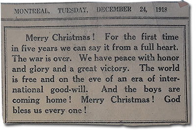 La nouvelle n’est parvenue par courrier à Moose Factory que la veille de Noël. Comme la dernière livraison du courrier remontait au 11 novembre, le poste avait raté la nouvelle de peu. L’entrée du 24 décembre comprend une coupure de journal qui résume l’état d’esprit du pays :
