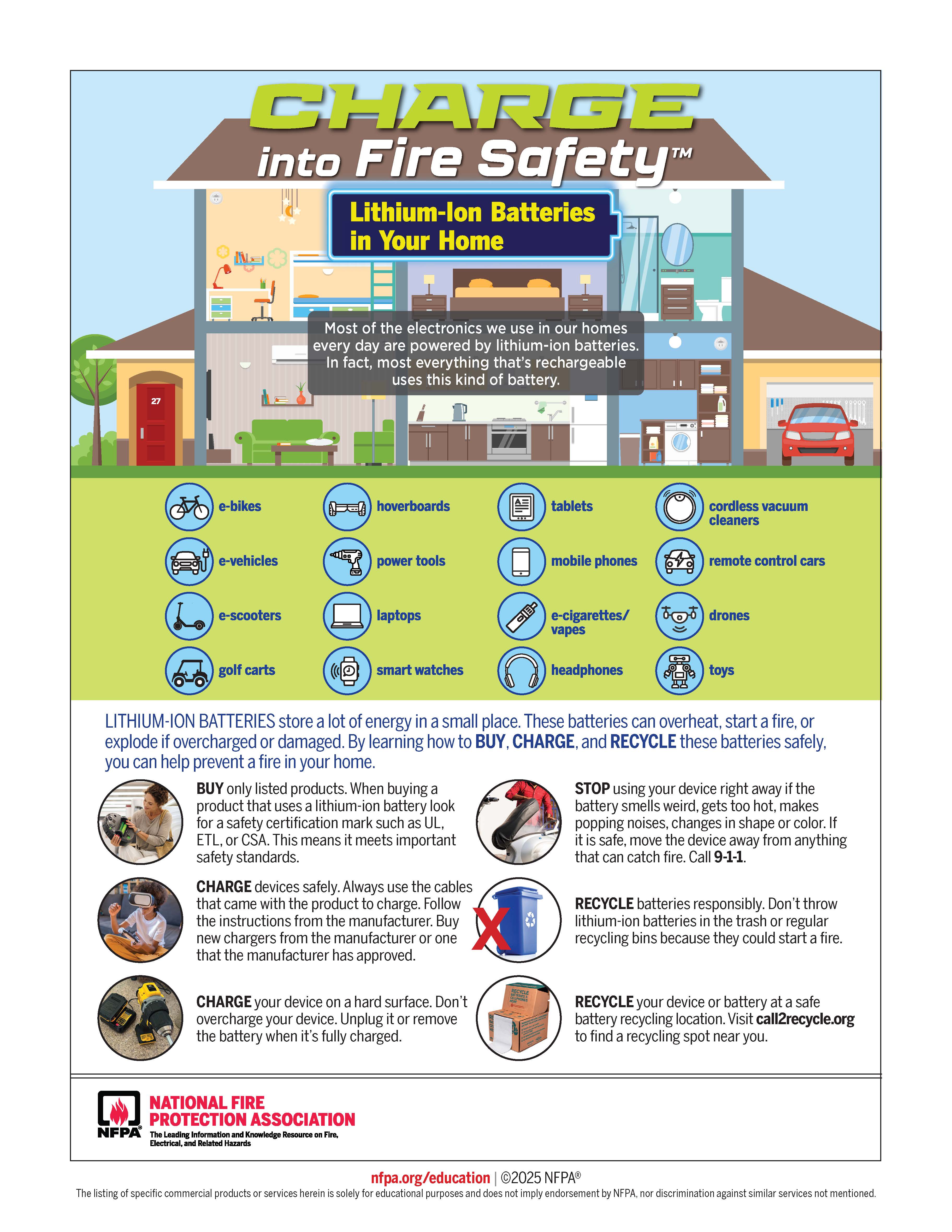 This year's Fire Prevention Week™ (FPW™) campaign, October 5-11, "Charge into Fire Safety™: Lithium-Ion Batteries in Your Home," works to educate everyone about using these batteries safely. The campaign stresses how important it is to BUY, CHARGE, and RECYCLE safely when it comes to lithium-ion batteries.