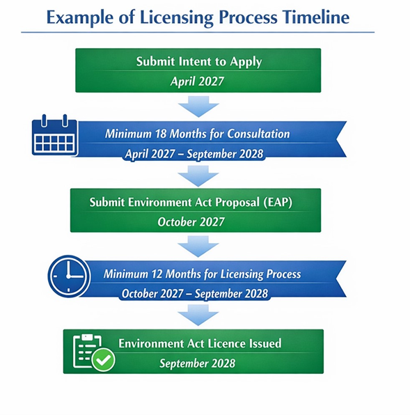 The project proponent submits a complete Environment Act Proposal to the Environmental Approvals Branch. The assessment and licensing may take a minimum of 12 months, provided the proponent submits a complete Environment Act Proposal. This timeline ensures adequate time for public and provincial technical expert review and comment before licensing decisions are finalized. A complete Environment Act Proposal typically includes a cover letter, Environment Act Proposal form, supporting reports and plans, and an application fee. The proposal must be prepared following Environment Act Proposal Guidelines.