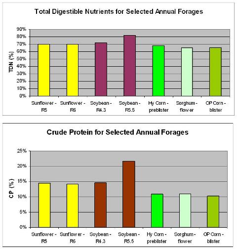 The samples show that energy content of all crops are sufficient for gestating beef cows, and that the protein content of sunflowers and soybeans are sufficient; however that of the hybrid corn, sorghum and open pollinated corn may need additional protein as cows enter into the third trimester. Caution should also be taken to monitor forage nitrate levels to avoid livestock poisoning – crops grown in high nitrogen soils are most at risk of livestock poisoning. Caution should also be taken when grazing soybeans as they can cause bloat, albeit less so than alfalfa and clovers. Avoid grazing mature soybean crops as the seeds contain trypsin inhibitors, which are dangerous for young ruminants (ie. calves) and monogastric animals. Older ruminants are not as susceptible.