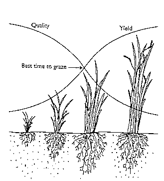 The seasonal growth pattern of most forages is well known (Figure 1):fast growth in the early part of the growing season, slow growth in the later part of the season. Balancing the forage needs of the livestock is both an `Art and a Science' for the grazing manager. Intensive management promotes forage recovery after grazing and timing the grazing before the plant becomes too mature by adjusting the grazing and rest periods and in some situations, harvesting the surplus for hay.