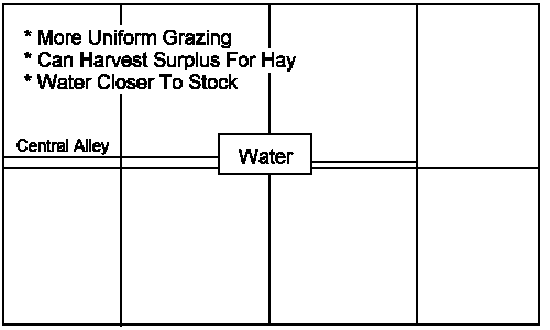 It is suggested that for cattle, paddocks should be as square as possible for more even grazing and to have good manure distribution (figure 2). These paddocks are also easier to harvest surplus for hay or silage. Long narrow paddocks will result in excessive grazing and manure near the water source, with undergrazing at the far ends of the paddock. Horses prefer longer paddocks for exercise (figure 3).