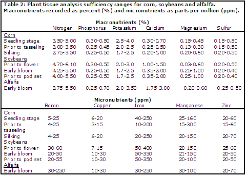 We must also recognize that feed test samples collected do not follow the sampling guidelines used in tissue tests which are calibrated for specific plant parts (top 6 inches) and stages of maturity (early bloom in alfalfa). For this reason, a feed test should only be used as a guideline and must be followed up with a tissue or soil test to determine the actual deficiency and amount of fertility to apply.