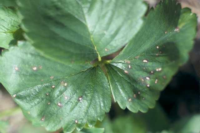 This disease first appears on leaves as purplish spots that resemble leaf scorch (see color section). Later these spots enlarge to a diameter of 0.13 to 0.25 in (3 to 6 mm). The centers become grey or white with reddish to purplish borders. Leaf petioles or stalks, stolons, runners and, to some extent, calyxes (caps or hulls) may be attacked.