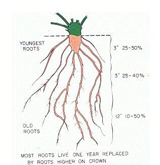 The root system consists of main or primary roots and secondary roots which grow from the primary roots. A mature plant may have between 25 and 35 primary roots. They may live one or more years with new primary roots being produced at a higher point on the base of the crown.