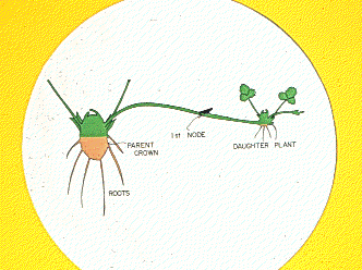 The crown is a short stem where leaves develop at points called nodes or auxiliary buds. New leaves develop with a bud in the axil of each leaf (auxiliary buds). These auxiliary buds will either remain undeveloped, grow and form runners or grow to form a side or branch crown.