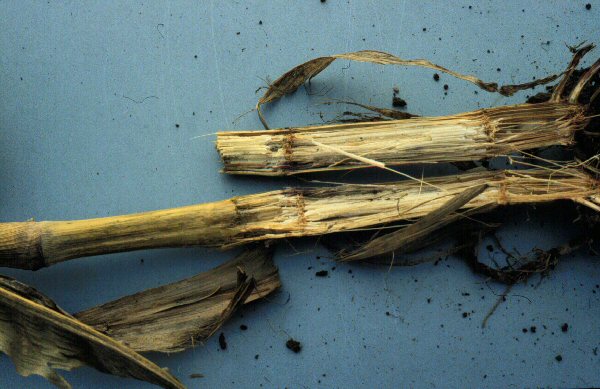 The term “stalk rot” has been used to refer to any situation in which corn stalks are broken, lodge, or die prematurely. In the strictest definition, this section will refer to stalk rots as decay of the internal stalk tissues. Generally stalk rot fungi, do not significantly damage healthy plants. While the stalks contain a high level of carbohydrates, corn plants are able to tolerate most stalk rot organisms. As grain filling reduces the reserves in the stalks, susceptibility to infection increases. Stalk rots are generally observed later in the season, often some time after the infection has taken place, when the grain is drying down in the field.