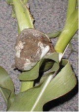 Smuts are one of the easier corn diseases to identify. The main symptom is the formation of conspicuous swellings or galls. Initially, these galls have a glistening, greenish to grey-white surface (see Figure 8). Later, the interior of these galls darken and rupture, releasing masses of powdery, dark olive-brown to black spores (see Figure 9). Leaf galls tend to appear more blister-like, and do not rupture (see Figure 10). As galls mature, they may reach 15 cm in diameter. Galls on leaves usually remain small, ranging in size from 0.6 to 1.2 cm in diameter.