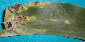 The rust organism produces many small golden-brown blisters on corn leaves. As the disease progresses, these spots split open releasing the characteristic powdery, rust-coloured spores. Because this disease is favoured by cool, damp weather, it usually does not develop until late in the growing season and is relatively minor. In addition, most modern hybrids have adequate resistance to rust.