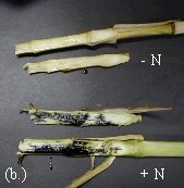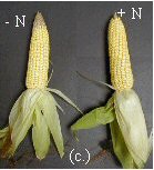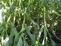 Nitrogen deficiency is characterized by stunted spindly growth and yellowish green foliage in young plants. Older leaves will show a V-shaped yellowing of the inner leaves with margins remaining green (Figure 12). The newest leaves show the symptoms of nitrogen deficiency last since nitrogen is mobile within the plant. The symptoms will be most obvious in lower, poorly drained parts of the field, or on sandy soils after heavy rains.
