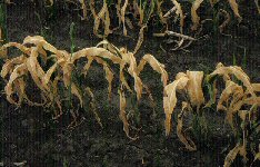 Seedlings can be directly damaged by wind. Blowing soil particles causing abrasions on leaves and stems and can uproot or break off young plants. Dead or damaged tissue will turn brown and dry up. Shredding of young leaves is frequent. Strong winds following a period of rapid vegetative growth may snap off corn plants at the lower nodes, which is known as ‘green snap. If the plant is severely severed, grain yield will be drastically reduced. Strong winds during grain fill may result in root and stalk lodging (Figure 18).