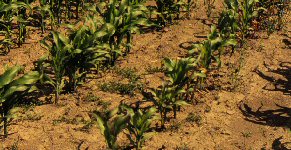 Lack of water will cause corn leaves to roll and turn a dull grayish green. In older plants, nitrogen deficiency symptoms may develop. Severe stunting and irregular brown patches of dead leaf tissue may occur (Figure 16).
