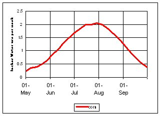 Corn requires increasing amounts of water as the season progresses. In an average year, a 120 bu/ac corn crop uses about 21 inches. Corn takes up and evaporates through its leaves about 350 litres of water for every kilogram of dry matter that is produced. Weekly corn water use is presented in Figure 2. Peak water use is during the reproductive phases of silking and pollination.