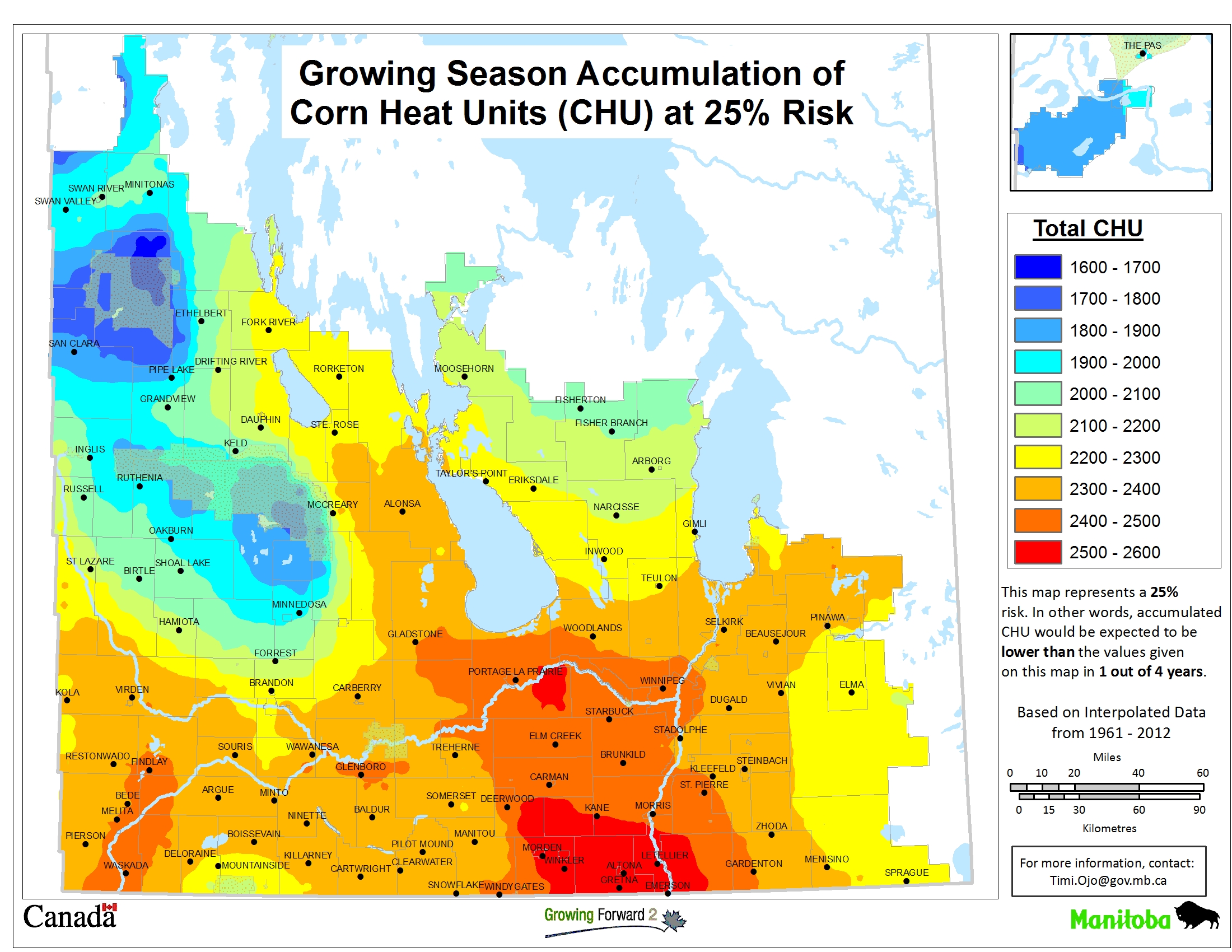 In Manitoba, as well as other parts of Canada, cumulative temperatures such as Corn Heat Units (CHU) are closely related to development. CHU are better than calendar days for measuring time between stages because, in warmer regions, more CHU are accumulated per day so that corn develops faster per day than in cooler regions.
