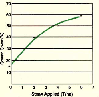 Mulch - A mulch can provide the same erosion control benefits as a well-established cover crop. Wheat straw (large round bales) spread over the field with a bale shredder can give good protection to the soil after harvest. Figure 2 shows at the highest level of application, 6T straw/ha, the ground cover by straw was estimated at 60%. This was still below the optimum level of 65% ground cover.