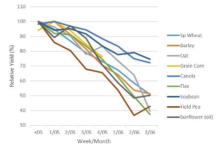 Perhaps the biggest driver for early seeding is the potential for higher yields. The majority of seeding date research conducted in Western Canada, reports increased yields with early seeding. Farmer reported data in Manitoba to Manitoba Agricultural Services Corporation (MASC) also shows that earlier seeding dates generally result in higher yields. Figure 1 shows the average relative yield of various crops as seeding date moves from late April to mid June. Average relative yields were highest for spring wheat, oat, flax, soybean, field pea, and sunflower for the late April seeding date. Barley, grain corn, and canola yields were highest on average when seeded the first week of May. It is important to keep in mind that the data presented is for final crop in the ground.