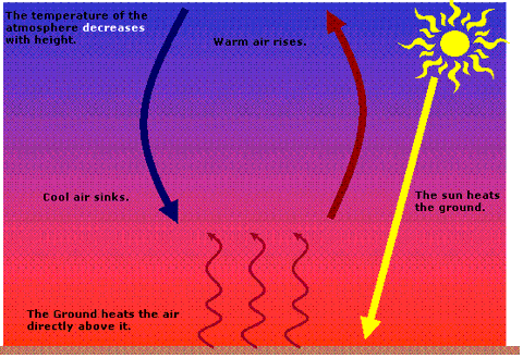 A similar process occurs on a daily basis in the atmosphere. The sun heats the ground and the ground in turn heats the air directly above it. This results in the temperature of the atmosphere decreasing with height. As the air near the ground heats up it begins to rise. This air will continue to rise as long as it is warmer than the surrounding air. As this warmer air rises, cooler air from above moves in (or sinks) to take its place near the ground. The greatest amount of convective mixing occurs during the warmest part of the day. On any given day, convective mixing can carry smoke from hundreds to thousands of metres into the atmosphere, which makes it a far more effective mixing mechanism than wind.