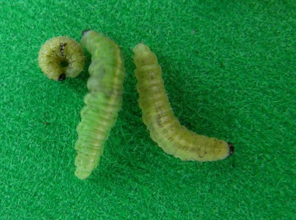 Larvae: Larvae (Figure 2) will initially feed within the stem, then move to developing buds and the newest leaves.