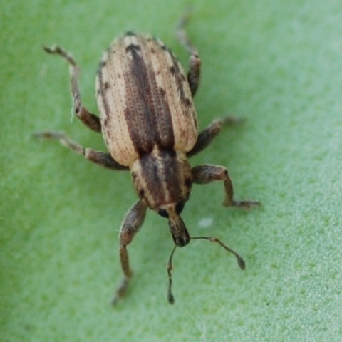 Appearance of Adults: Light brown with a darker stripe down the middle of the back. Being weevils, they have a narrow beak (or rostrum) extending in front of their head. Their chewing mouthparts are at the tip of this beak.
