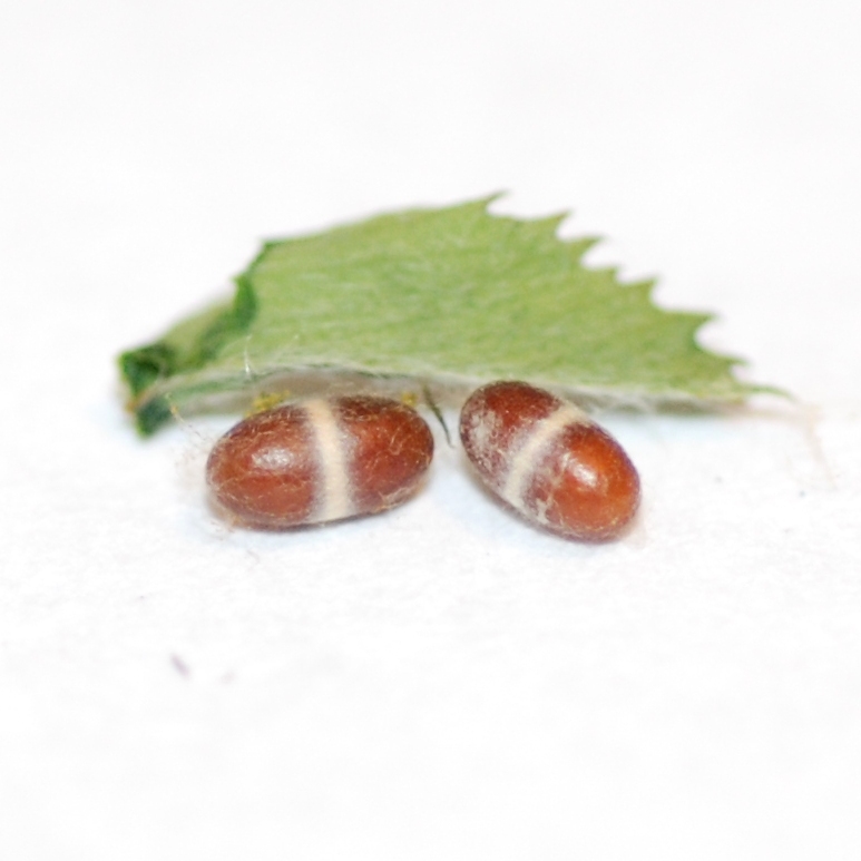 Eggs: Eggs are bright yellow and about 0.5 mm. As they develop they turn olive-brown, with the black head capsules of developing larvae visible through the casing. They hatch in one to two weeks.