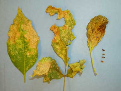 These insects feed by piercing leaf tissue and sucking plant juices from the leaves. In relatively minor cases, the leaves will have some white stippling on the surface of the leaves and the trees are otherwise unaffected. In more severe cases the leaves will turn brown and curl along the edges, sometimes resulting in significant leaf drop.