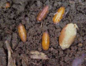The pupae (cocoons) are elongated and brown, resembling small wheat kernels. Pupation occurs in the top 5 to 20 cm (2 to 8 inches) of soil. Pupation lasts about two weeks (unless interrupted by winter), after which the adult fly emerges and the cycle repeats itself (where there are two generations per year). The summer's second generation of pupae usually remain dormant over the winter, and emerge as adult flies the following spring.