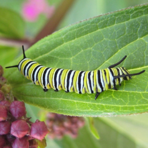 Above: (L) An adult monarch butterfly. (R) A monarch butterfly caterpillar on a milkweed plant.