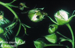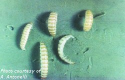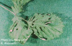 Early season symptoms are indicated by longitudinal holes in the foliage, leaving a tattered appearance. This injury is caused by adult feeding. Excessive feeding by adults may cause leaf skeletonization. Numerous adult beetles may destroy entire flower clusters. Larval tunnelling through receptacles can cause loosening of berries so that they fall off before harvest. Contamination of harvested fruit by larvae can be a serious problem. Larvae cause more problems than adults.