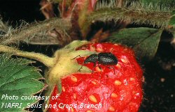 The larvae devour the roots and the adults feed on the edges of leaves. Injury from the adult weevils feeding on leaves and fruit is relatively unimportant except as an indicator of weevil presence. Most injury results from the larvae feeding on the roots. Plants are stunted, the foliage turns red, and fruit is small and seedy. Injured plants may wilt and die during dry periods in summer. When numerous, these insects can destroy a strawberry planting in one season.