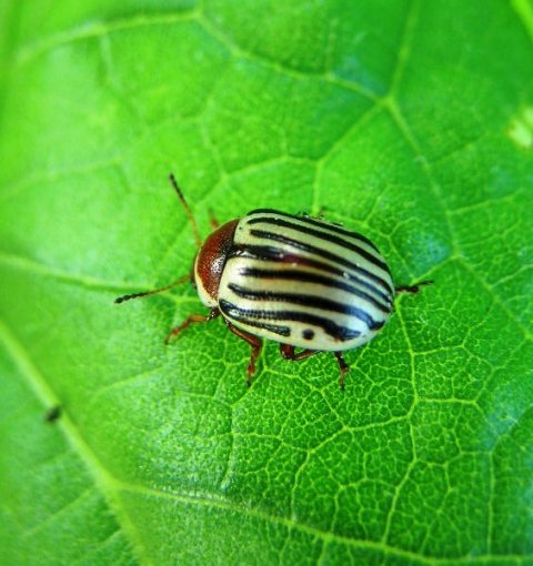 | Overwintering adults become active, start feeding | Adults continue feeding, lay eggs | Larval feeding on leaves | Larval feeding ends, pupation in soil begins, new adults emerge | New adults emerge and feed, enter soil to overwinter |