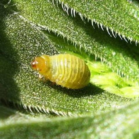 Lifecycle: Sunflower beetles overwinter as adults in the soil. They emerge in the spring from fields where sunflowers were grown the previous year. Usually their emergence coincides with the time that sunflower seedlings begin to appear in late May. The beetles feed throughout the day on the emerging seedlings. Eggs (Figure 2) hatch about a week after they are laid and the young larvae feed on the leaves at night. They hide among the bracts of the flower bud and in the axils of the leaves during the day. The larvae feed for about two weeks but, because of the long egg laying period, larvae may be present in the field for about six weeks.