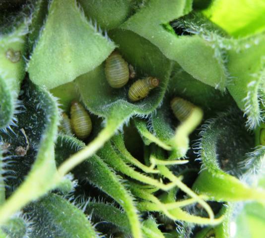 Figure 3. Larva of sunflower beetle. Figure 4. Larvae hiding among sunflower bracts