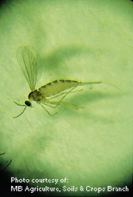 | Overwintering larvae pupate | Adult midges emerge, egg laying begins | Larval feeding | Larvae move into soil | Overwinter as larvae or pupae |