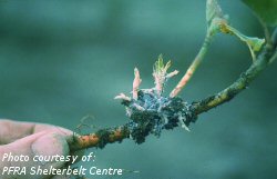 Saskatoon plants damaged by the woolly elm aphid may not show any symptoms until the following spring. In spring, damaged plants will break bud, produce a few small leaves and may die. Saskatoon plantings are susceptible in the year of establishment, but are most susceptible in the second and third growing season. Older plants may support populations of the aphid, but are not likely to be killed. Vigour and fruit production by older plants will be reduced by the aphid.