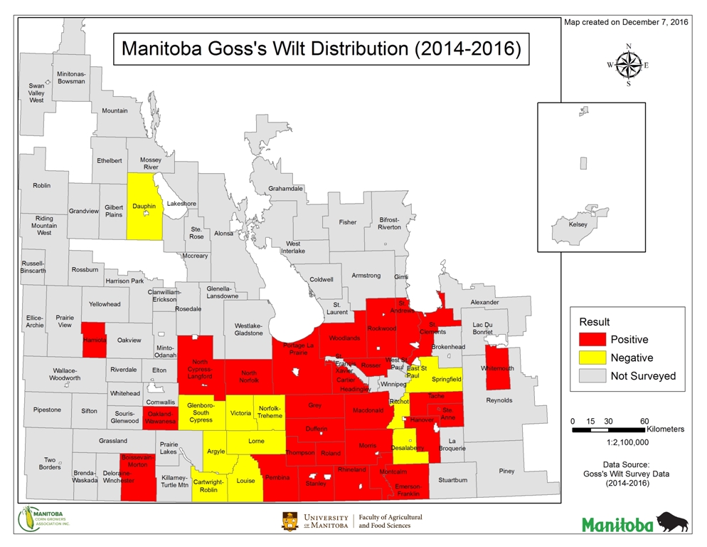 In 2016, a total of one hundred and forty two corn fields were surveyed by Manitoba Agriculture in partnership with Manitoba Corn Growers Association and University of Manitoba. A total of fifty nine fields tested positive for Goss’s wilt disease. In addition to fifty nine positively identified fields during 2016 Goss’s wilt disease survey, one field in the RM of Portage la Prairie, two in the RM of Oakland and one in the RM of North Cypress-Langford were also found to be positive for Goss’s wilt disease.The identifications were made based on visual identification and/or PCR assay